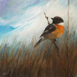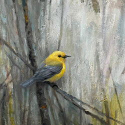 In recent pieces – a carefully rendered bird poised against an abstracted background, for example – he plays with the tension between realism and expressionism to give his subjects a palpable sense of presence and weight.