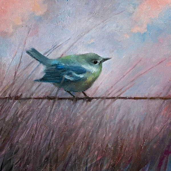 In recent pieces – a carefully rendered bird poised against an abstracted background, for example – he plays with the tension between realism and expressionism to give his subjects a palpable sense of presence and weight.